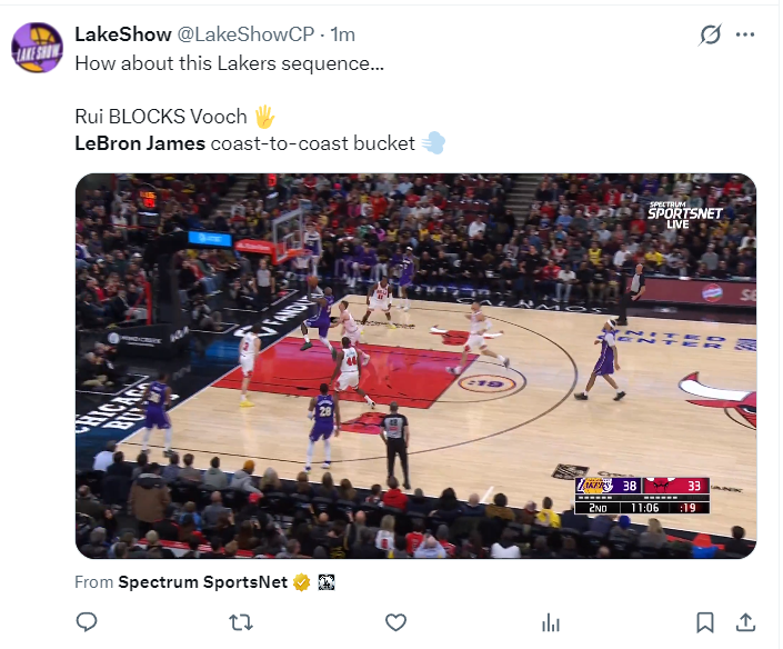 易边再战,湖三崩来了,湖人最多20分的领先被公牛一波流缩小到1分,这期间詹姆斯6分钟里1中0,好在八村垒、东契奇两人挺身而出帮助湖人稳定战局。第三节詹姆斯0分,东契奇单节20分,东契奇帮助湖人再度拉开到15分。